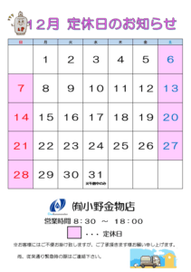 お知らせ 12月定休日のお知らせ 2025.11.27 いつもお世話になっております。 12月の定休日をお知らせ致します。 お客様にはご不便お掛け致しますが、ご了承いただきますようお願い申し上げます。 尚、従来通り緊急時の際はご連絡下さい。