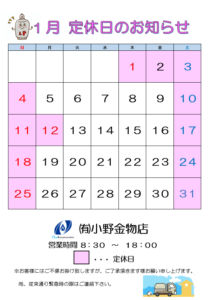 お知らせ 1月定休日のお知らせ 2025.12.29 いつもお世話になっております。 1月の定休日をお知らせ致します。 お客様にはご不便お掛け致しますが、ご了承いただきますようお願い申し上げます。 尚、従来通り緊急時の際はご連絡下さい。